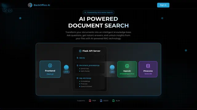 BackOffice AI turns PDFs, DOCX, and XLSX files into a smart, searchable knowledge base. Upload your documents once, ask any question, and get accurate, context‑based answers from your own content—no more manual searching, faster decisions, and hidden insights unlocked.
